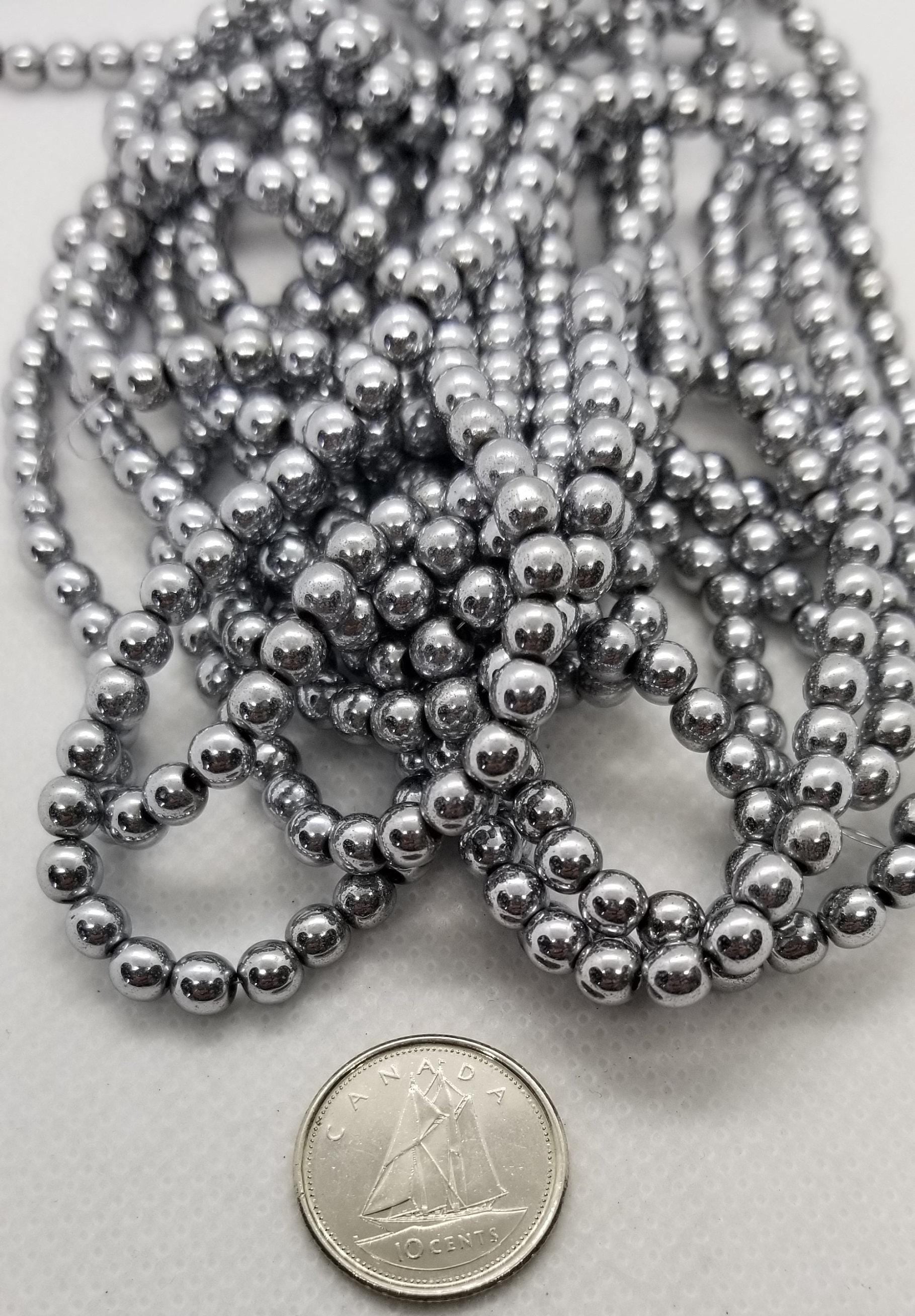 1 strand Round Platinum Hematite Spacer Beads, Grade A Non-magnetic Synthetic Plated, 4-6-8mm Hole 1mm, Full Strand bead count in desc