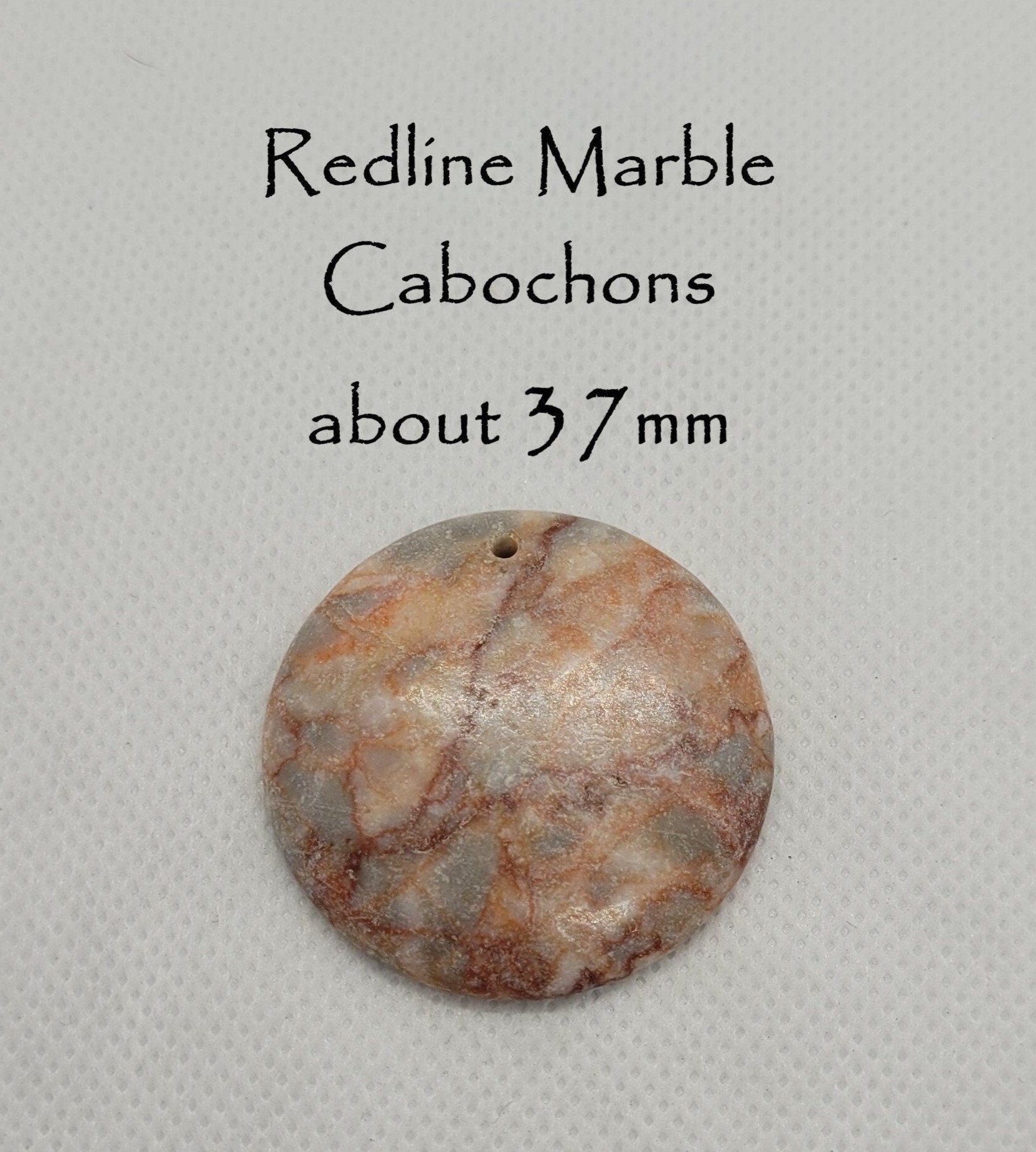 Enhance your jewelry creations with these Unique Natural Redline Marble Cabochons! Each round cabochon measures about 37mm in diameter with a width of 7mm at the middle and 4mm at the edge. The cabochons feature a small 1mm hole, perfect for adding a unique touch to your designs. Add these eye-catching cabochons to your collection today!