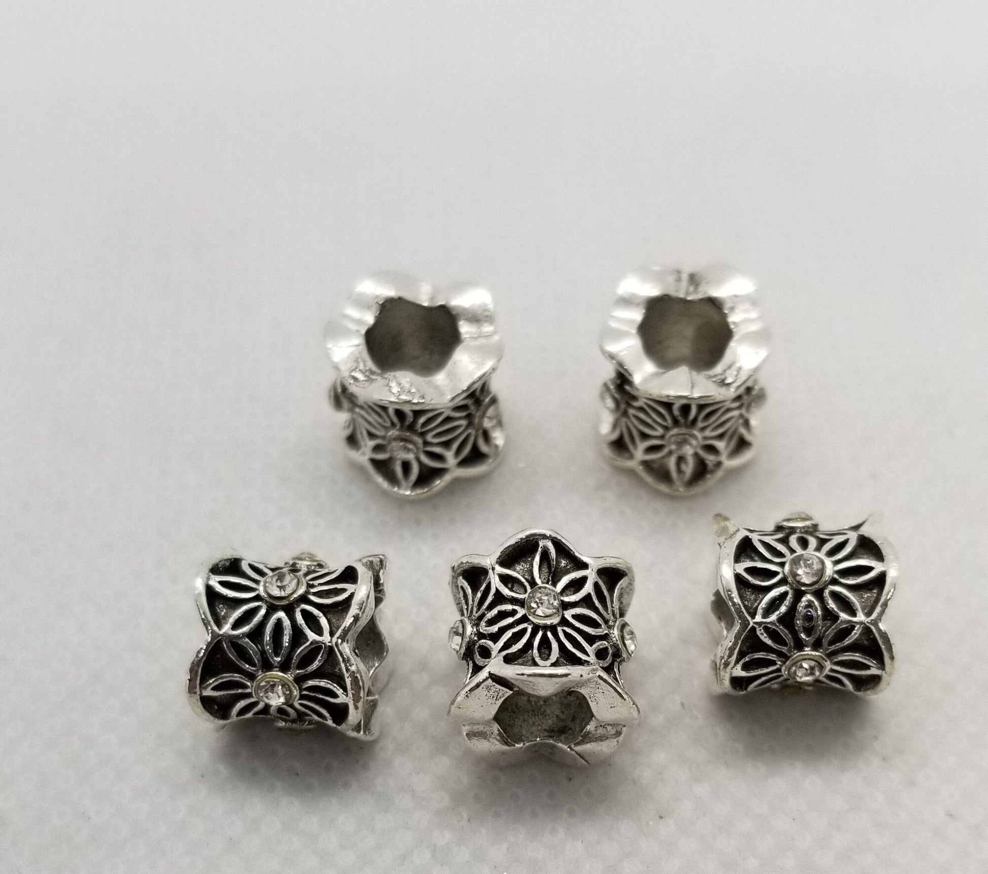 Beautiful silver columns decorated with silver flowers and rhinestones in the centers. Fantastic addition to your pieces or on their own as a focal. 2 pieces Antique Silver Column with Rhinestone Flower, Large Hole European Beads, 9x10mm, Hole 5mm