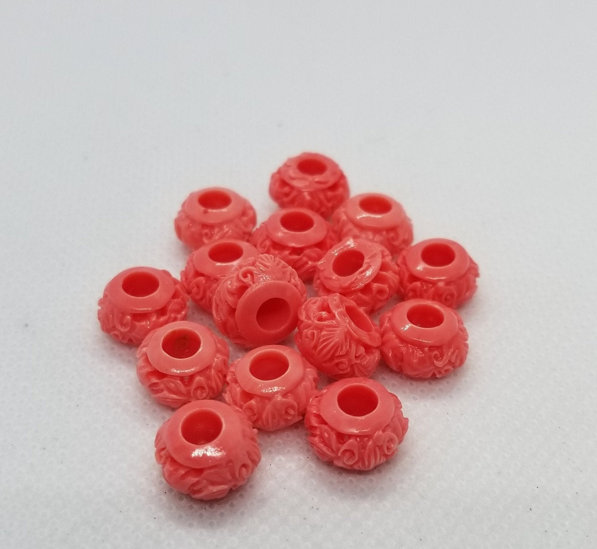 2 pieces Carved Coral Bead, Large Hole Beads, Dyed, Leaf Vine Pattern, Carved Rondelle, Synthetic, 11x7mm, Hole 4mm CLEARANCE