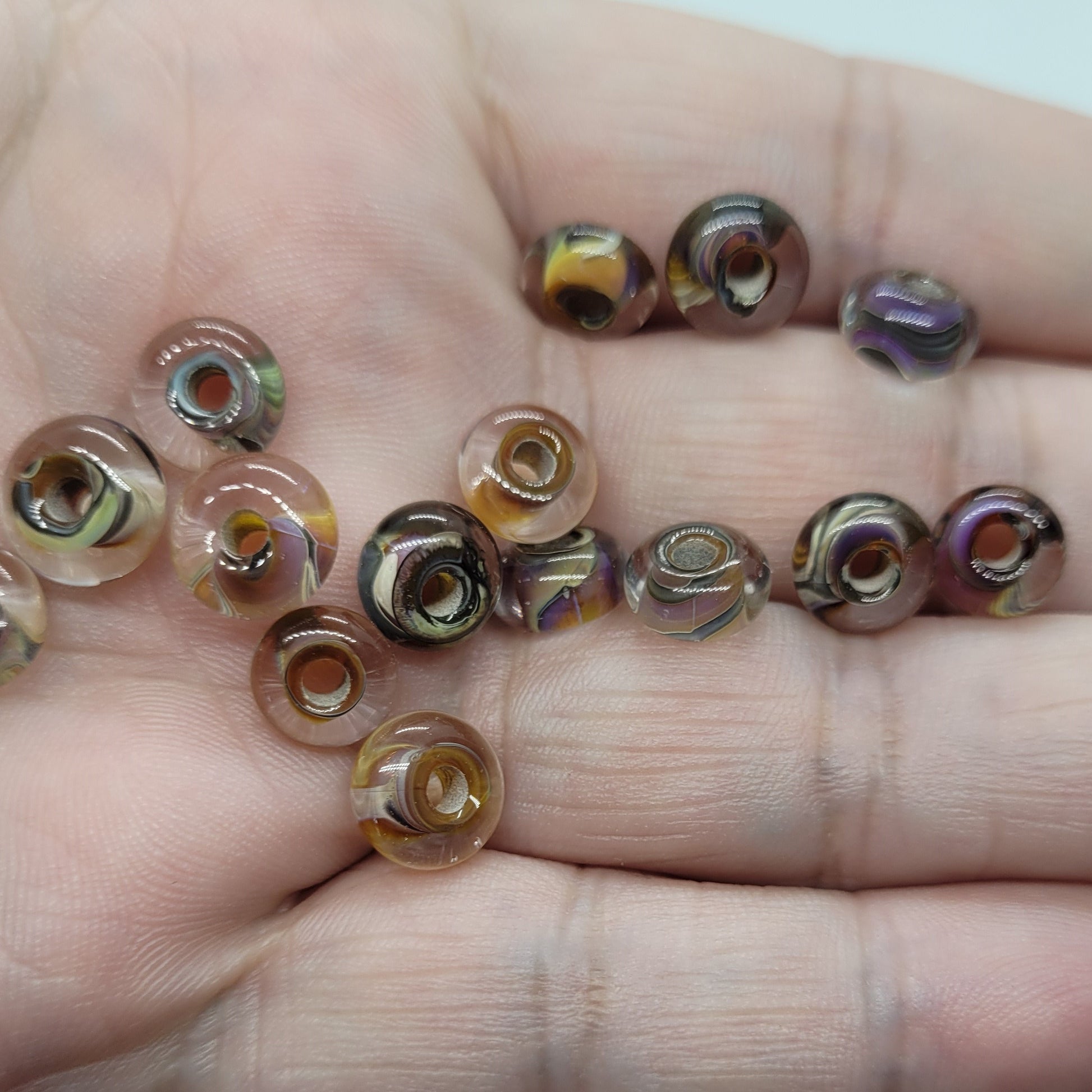 This set includes 5 pieces of uniquely handcrafted beads in a mesmerizing mystical gold hue with hints of purple, green and black throughout. With a size that ranges approximately from 8.25mm to 9.25mm in diameter and a width of 5mm, these beads are perfect for adding a touch of elegance and uniqueness to your designs. The large hole of 2-2.5mm ensures easy threading and allows for versatile use.