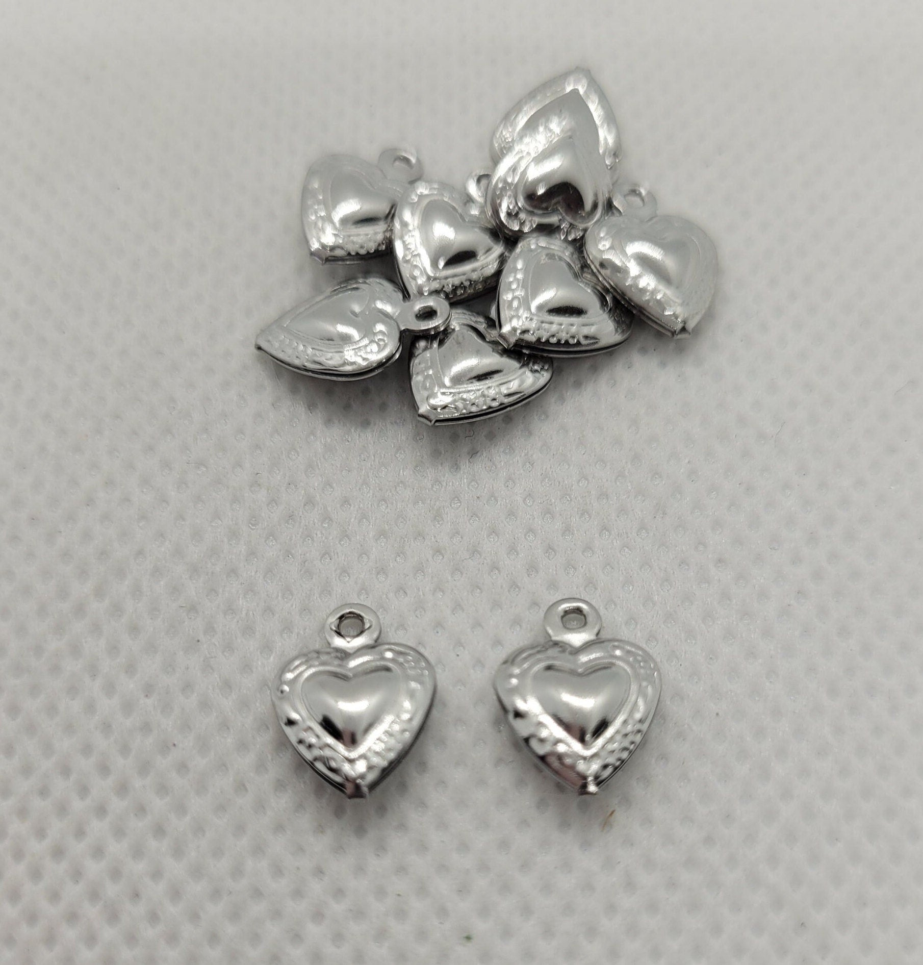 These cute little Silver Heart Charms are made from high-quality 304 Stainless Steel. Each hollow charm measures 12x9x3mm with a 1mm hole. Lightweight and versatile, these charms are perfect for any DIY jewelry or beading project.