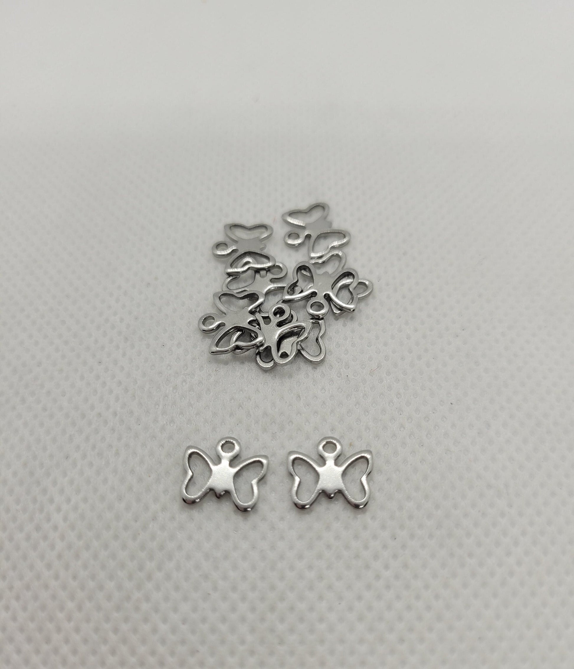 A touch of delicate charm for your jewelry creations with this set of 10 small butterfly charms. Made of high-quality 304 stainless steel in a sleek silver finish, each charm measures 9x10x1mm and features a hole size of ~1.3mm. Perfect for adding a whimsical accent to your bracelets, necklaces, and more. Let your creativity take flight with these beautiful charms!